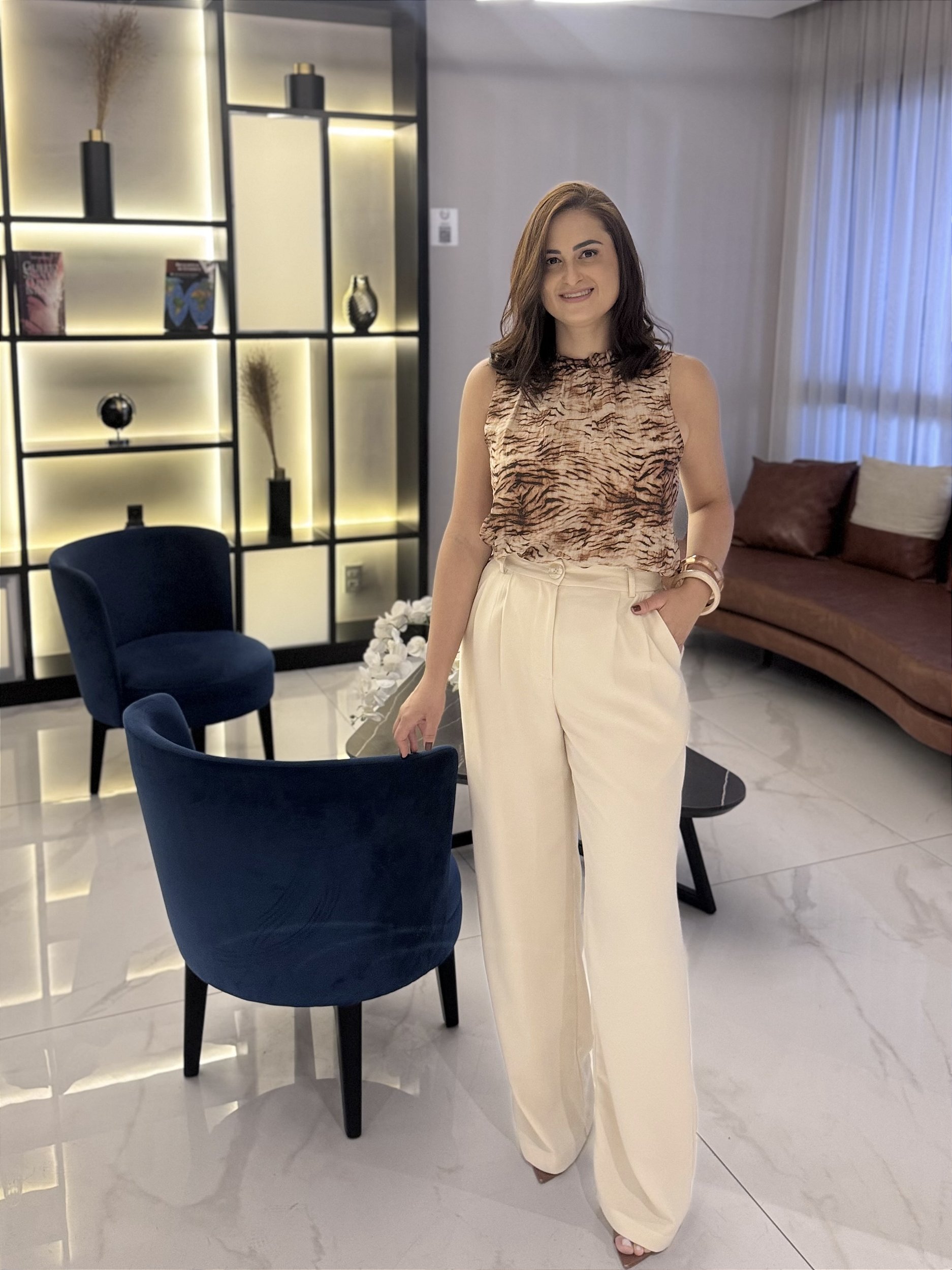 Blusa confeccionada em tecido leve e fluido com estampa com harmônica tigrada , sem mangas, possui gola alto com babadinhos, e fechamento com botões na costa.