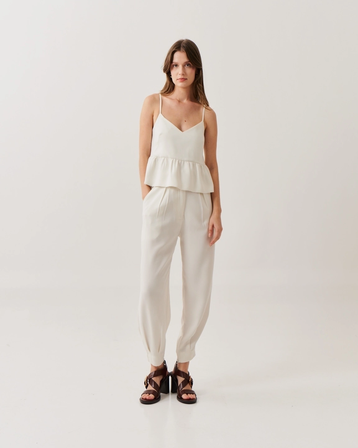 Calça de alfaiataria, modelagem cenoura, pregas frontais, maxi bolsos traseiro, com zíper na barra e botão madrepérola.
