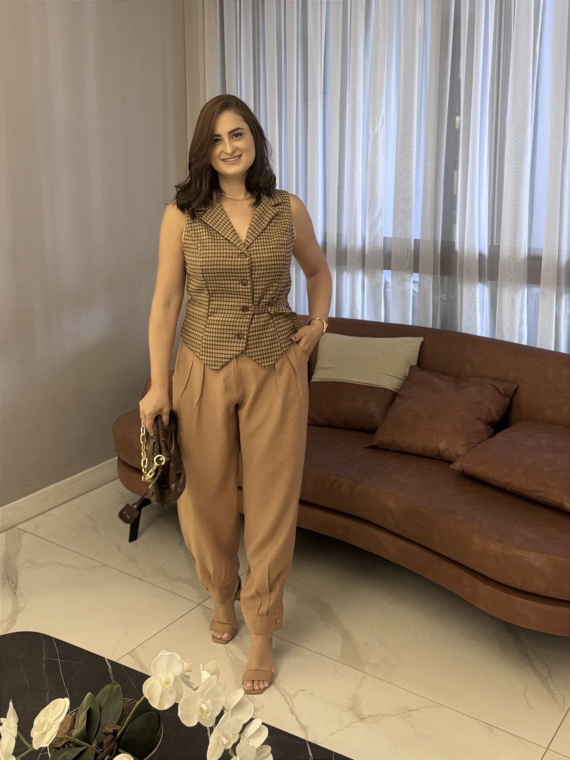 Calça em alfaiataria, modelagem cenoura, cintura alta. Cós largo, fechamento com abotoamento duplo, pregas frontais, bolsos laterais e traseiro.