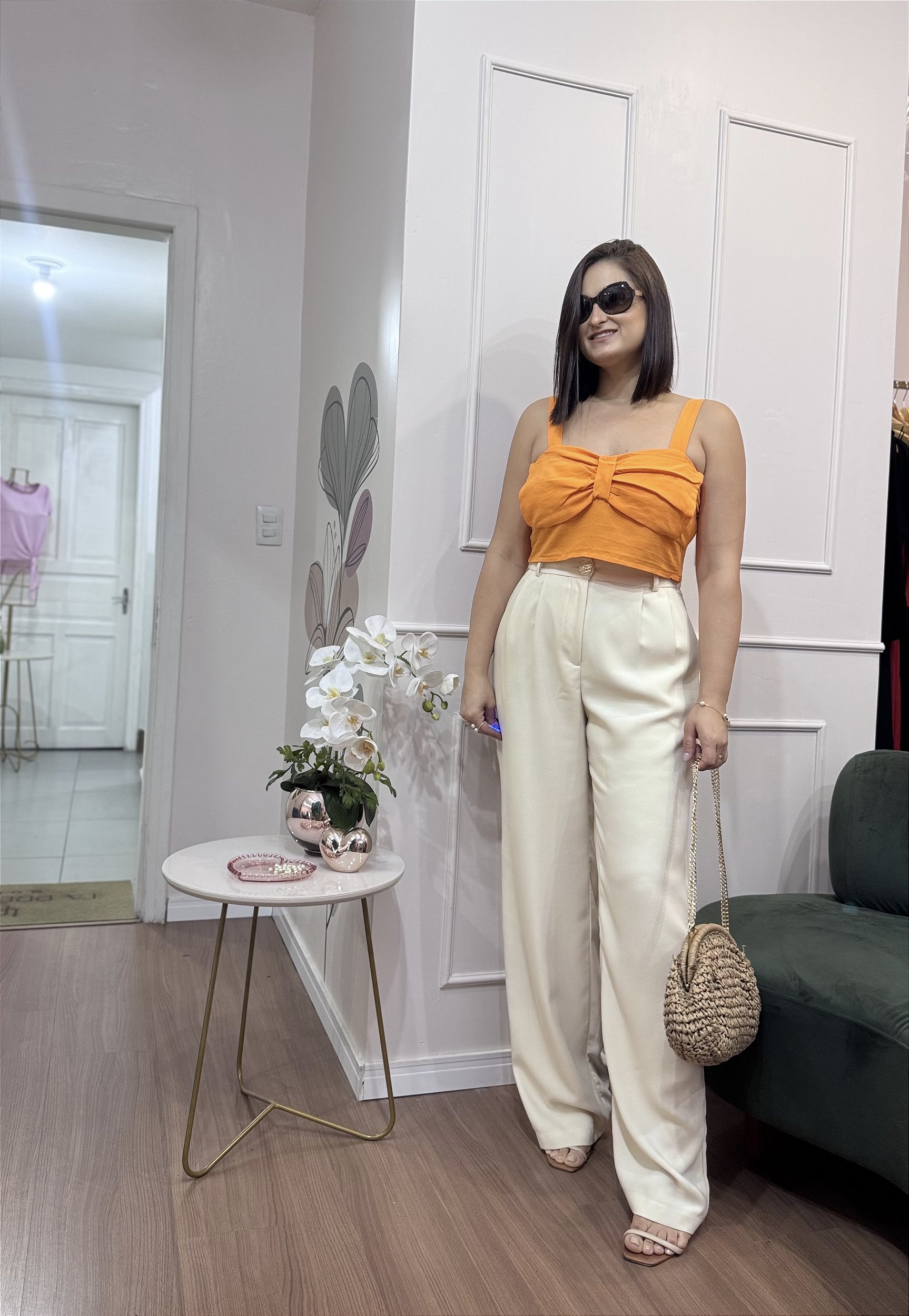 Cropped com detalhe em formato de laço no busto, alças largas, elástico no decote costas. Fechamento com ziper na lateral.Possui Forro .