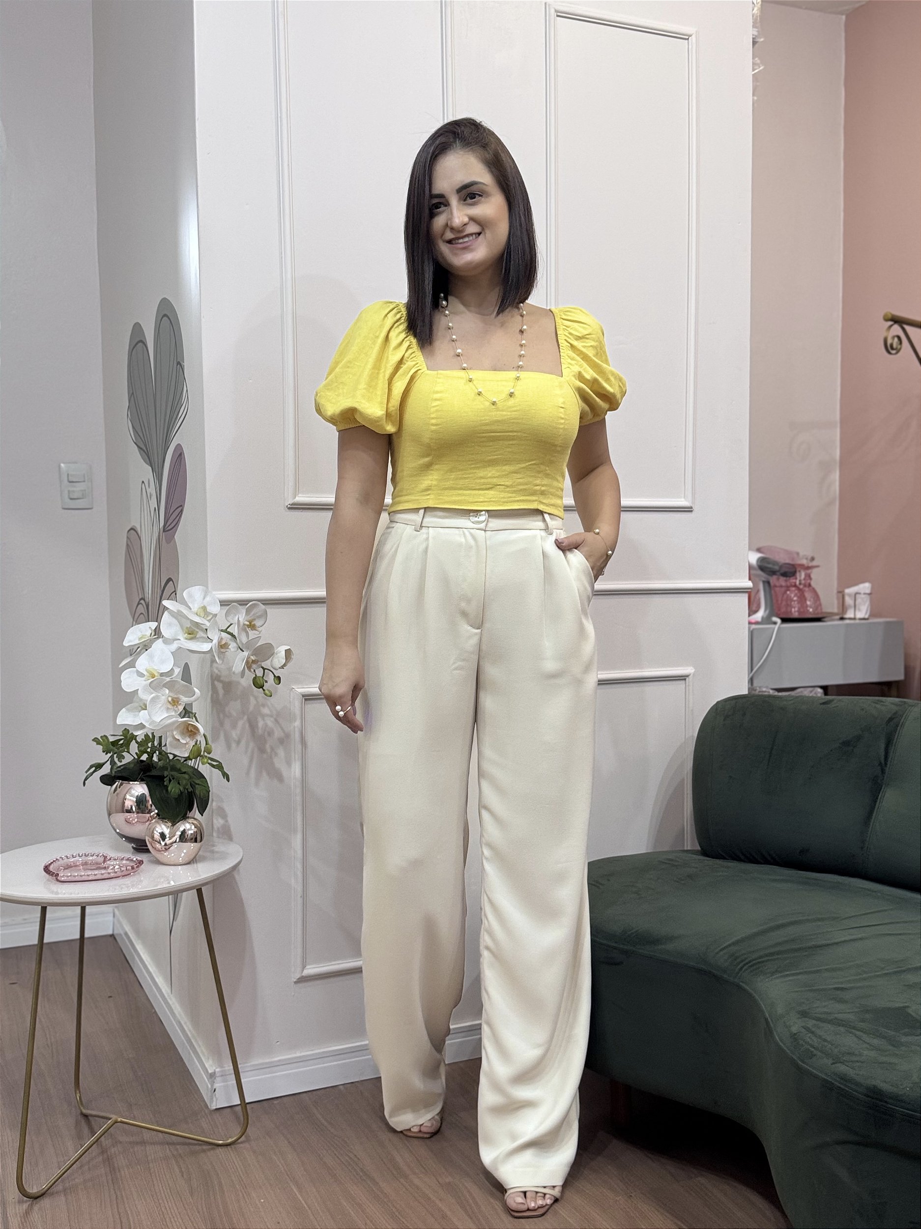 Cropped com decote quadrado, manga bufante com elástico, costa com látex e laço.