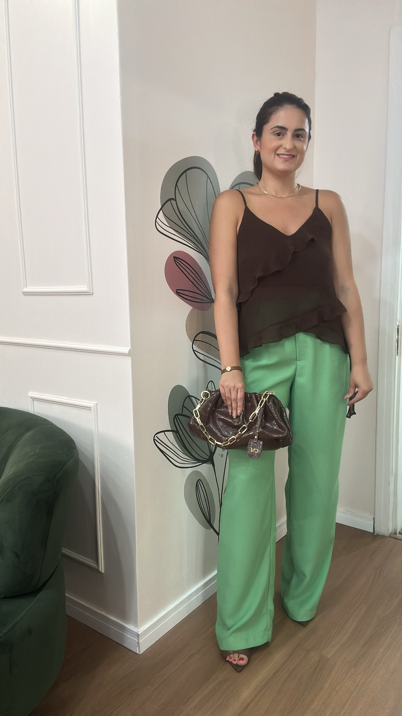 Regata em chiffon com alça fina e babados. Alça com regulador.