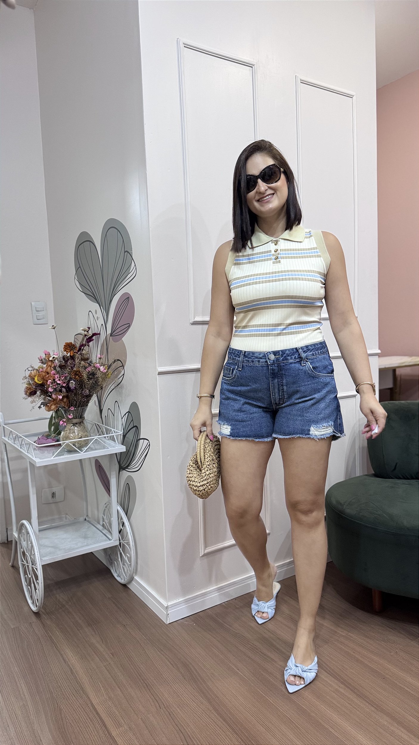 short angela com lavanderia médio, cintura intermediária, detalhe destroyed e barra desfiada.